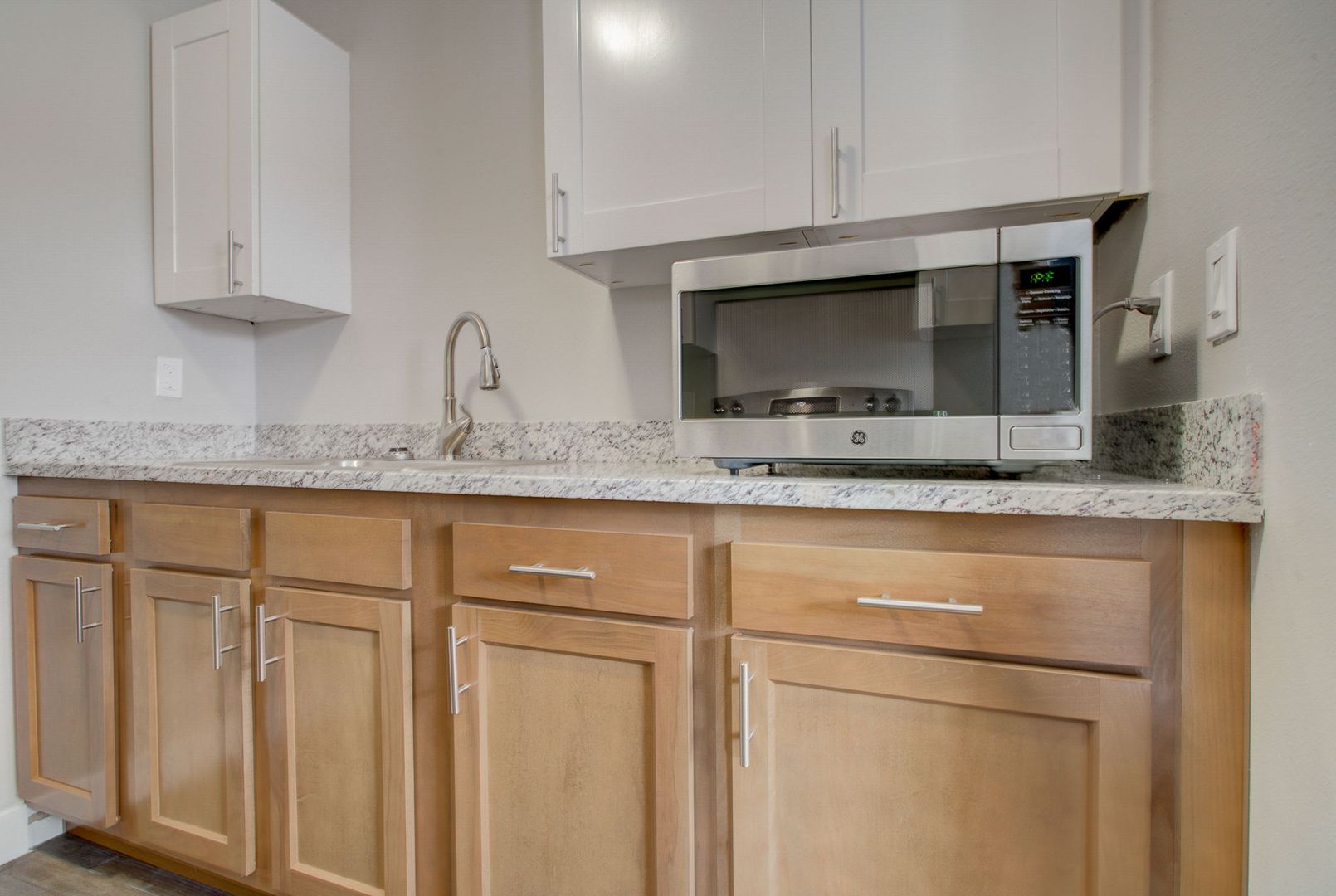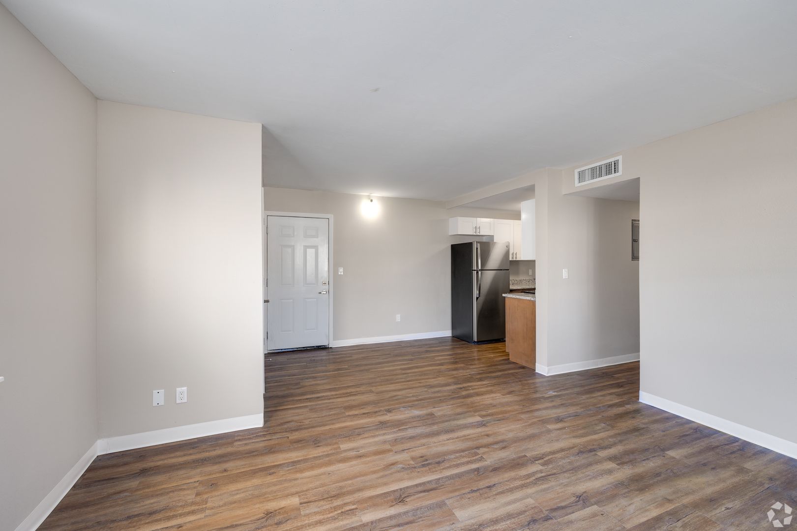 The living area is bright and open, featuring updated wood-style flooring and neutral finishes throughout. The renovated kitchen includes modern cabinetry, updated countertops, and full-size appliances, creating a clean, efficient space for daily use. Each bedroom offers comfortable space and natural light, while the bathroom has been refreshed with updated fixtures and finishes.